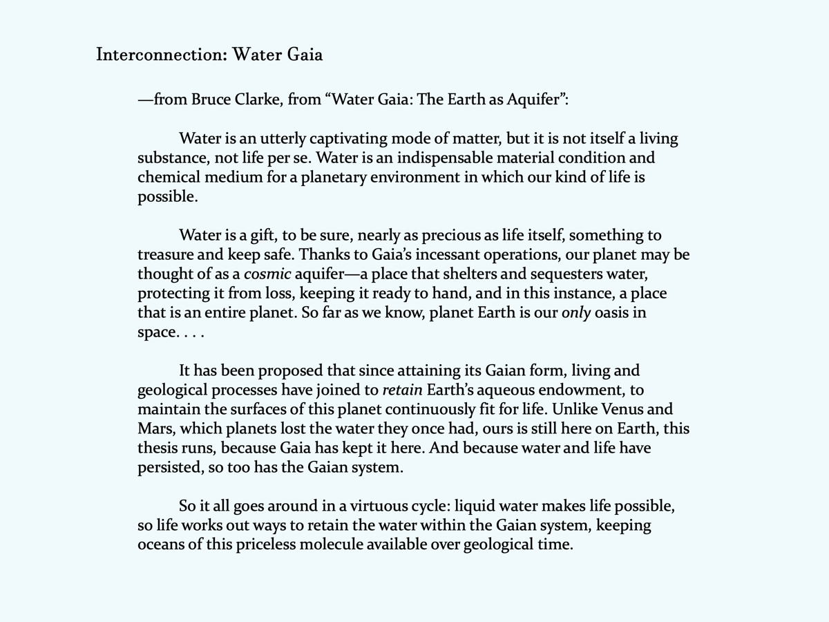 We interspersed musical numbers with short expositions, from the coalescence of the planet from the solar disk (Grateful Dead, "Dark Star"), to the evolution of photosynthesis (Kinks, "Sunny Afternoon") to the symbiogenesis of the eukaryotic cell (Youngbloods, "Everybody Get Together"), and on to the rise of ecosystems (U2, "Wild Honey") and the Gaian hydrosphere as first presented in the paper "Water Gaia" by Stephan Harding and Lynn Margulis. For this phase I began with a bit of my article on the Water Gaia thesis, "The Earth as Aquifer," followed by Van Morrison's "And It Stoned Me": "Oh, the water, oh oh, the water."